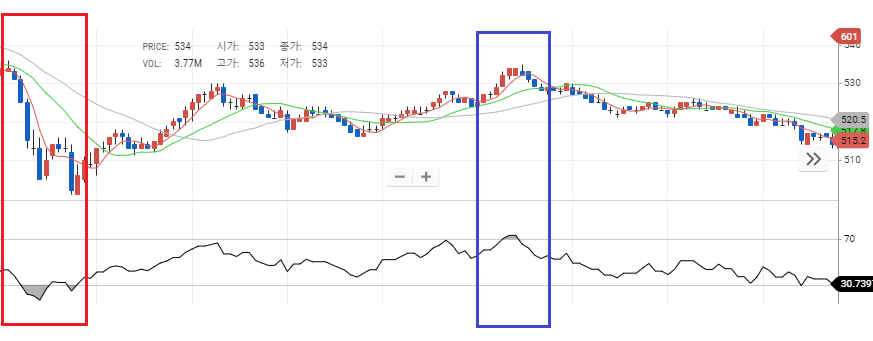 RSI 값이 70% 이상이 되었을 경우 매수세가 비정상적으로 늘어난 것이고 주가 또한 상승했다고 볼 수 있습니다.