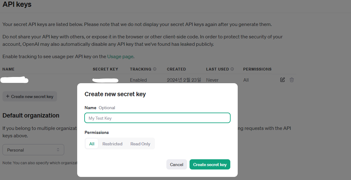 - OpenAI 계정 생성 및 API 키 받기: