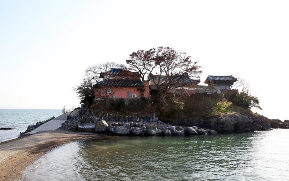 간월암은 바닷가에 떠 있는 작은 섬 사찰로, 바닷물이 빠져야 진입할 수 있는 독특한 구조입니다.